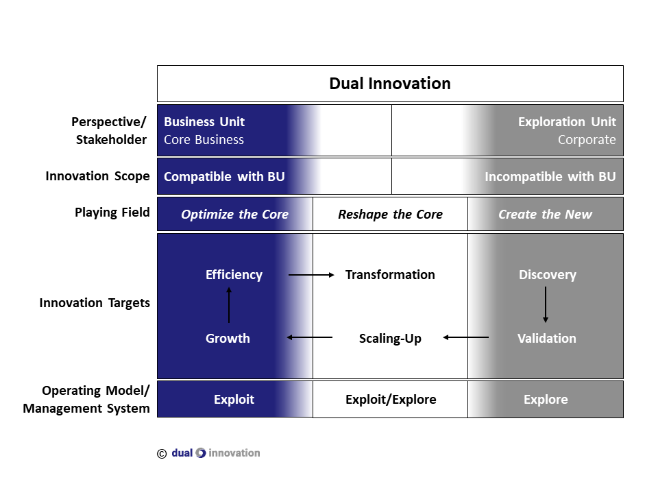Dr. Ralph-Christian Ohr’s work now has a two-fold focus on proposing the Dual Innovation management system for use in companies as a future-proof approach and on Scaling-Up to help companies systematically translate explorative activities into actual businesses, which is at the core of Dual Innovation and has been largely disregarded up to now. Check out Frank Mattes’ and his book Scaling-Up Corporate Startups: Turn innovation concepts into business impact for a deep dive into the practical aspects of Scaling-Up.