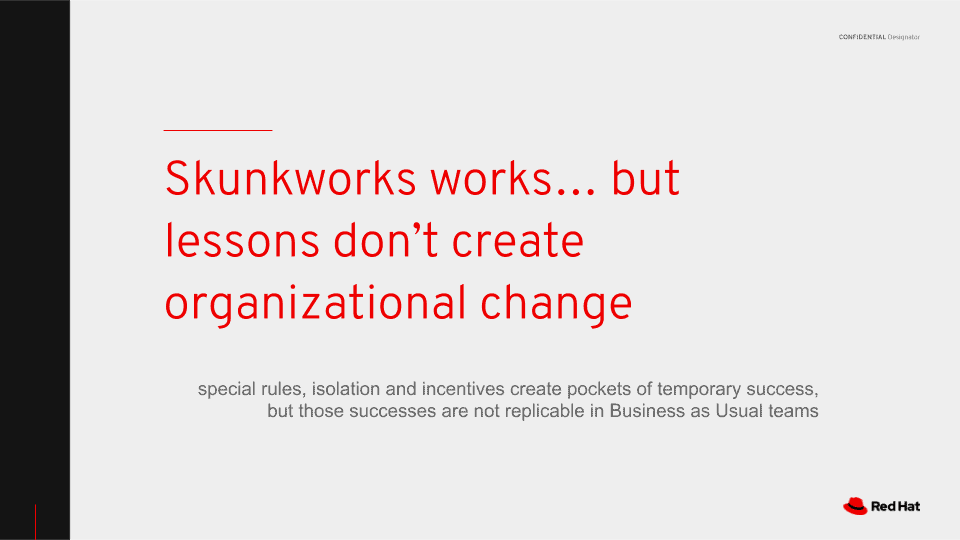 A huge catalyst to cultural changes is the introduction of a new generation to the workforce; organizations are being pushed to change based on the evolution of how employees want to work. Kris told me she finds this disruption exciting. “One of the things that I’ve seen is some of the generation, the team members coming out of college and maybe a couple years out of college…they’re inherently more open and agile. They were brought up very culturally different than the generations before them.” She says she sees this within her own team and it’s been a huge asset. “They’re just working in a whole different way than some of us have been…While we are technology focused because we are supporting the Red Hat suite of products on a platform, my team beyond that is a group of musicians, artists, electronics geeks and master chefs. Quite a few of them have other creative interests that they draw upon, which I believe helps strengthen us as a team on a day to day basis.”