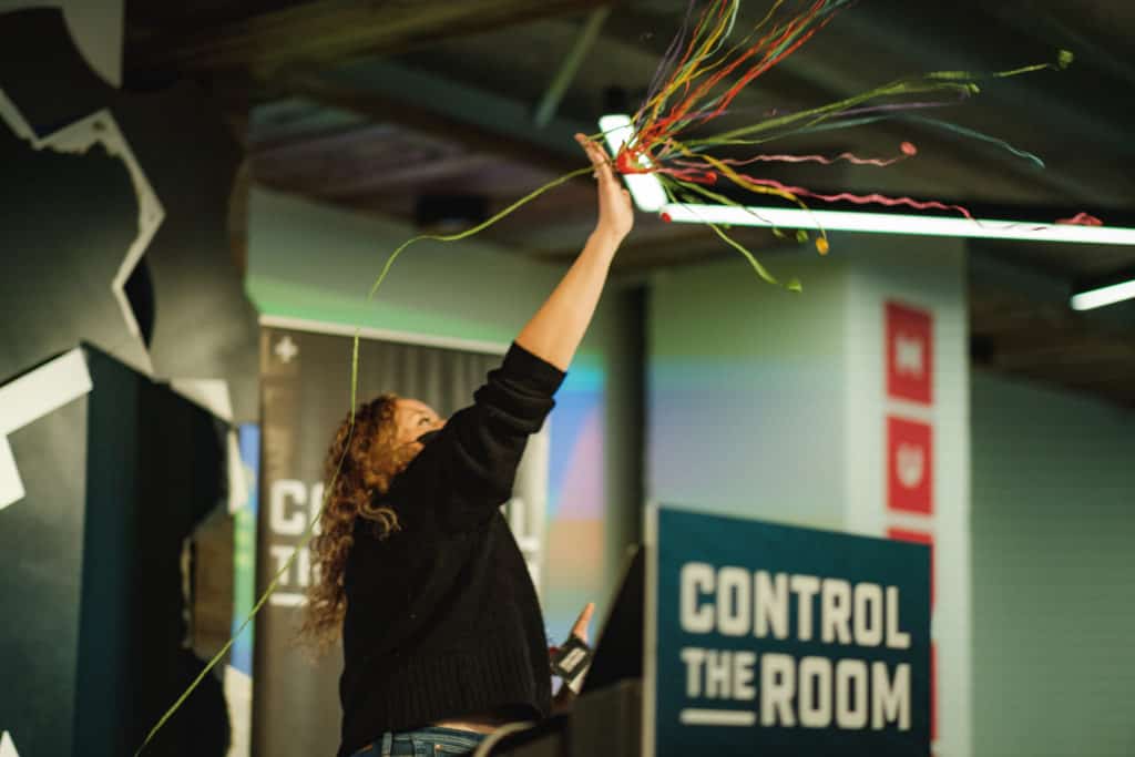 I want to do it all together, but I’ll do one first. Then I have another one. So what you’re going to do is you’re going to keep it looped on your finger and then throw up and it’s going to do that. Okay. But you want to keep, keep it on your hand. So, ready? Okay. On the count of three, we’re all going to do it together. We got some already. It’s all right. Ready? Three, two, one. Go. Yes. Awesome. I love it. That’s fantastic. And so as you’re doing that, think about the thing… Yes, it’s on the ceilings, look great. Like I said, just trying this out for the first time. We’re going to see how it goes and we’ll pull these back together. So what’s great about them is that you can actually just pull it back to you, wrap it up and then you can keep the celebration going on your table. Awesome. Thank you all for doing that and celebrating all the things that we need to celebrate together.