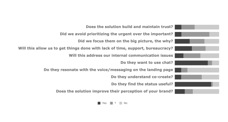 “After the great and really surprising insights we uncovered during the Design Sprint, we decided to go back to the drawing board and think of different approaches to communicate our value prop in more active and engaging ways than just a static, brochure-like intranet website. In the end, we crafted a ‘marketing plan’ aimed at improving the client experience. We are just now getting started rolling out each of the tactics that propel each objective in the strategy. The intranet portal will still be worked on, but it will be just a channel in a larger ecosystem.”