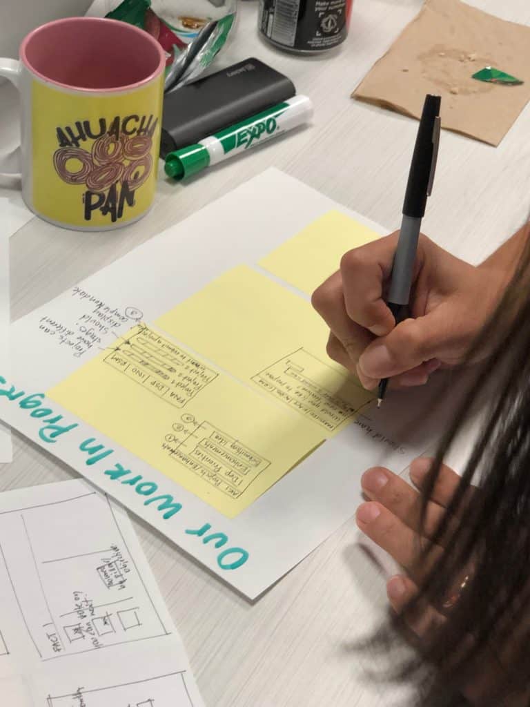 Once the heat maps were created, we led everyone through a speed critique and straw poll voting to narrow down the most popular ideas. Then the team leader used three super vote dots to select the winning solutions. We combined each of these sketches into a single solution for prototyping.