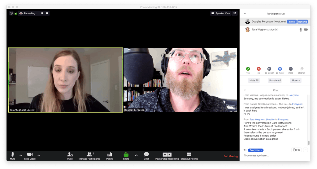After a welcome and intro, Douglas encouraged all participants to turn on their video feature to foster more connection with the group. Doing so, he explained to attendees, is a better way to show empathy to each other and bring the human element to virtual meetings–a vital component for successful virtual meetings and virtual facilitation overall, so we might as well start now!