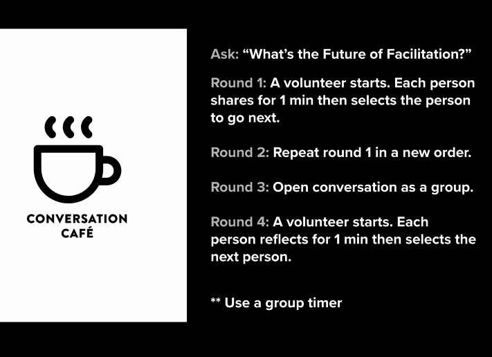 Participants were randomly assigned to breakout room chats in groups of four to discuss the question, “What’s the Future of Facilitation?” in a Conversation Cafe.