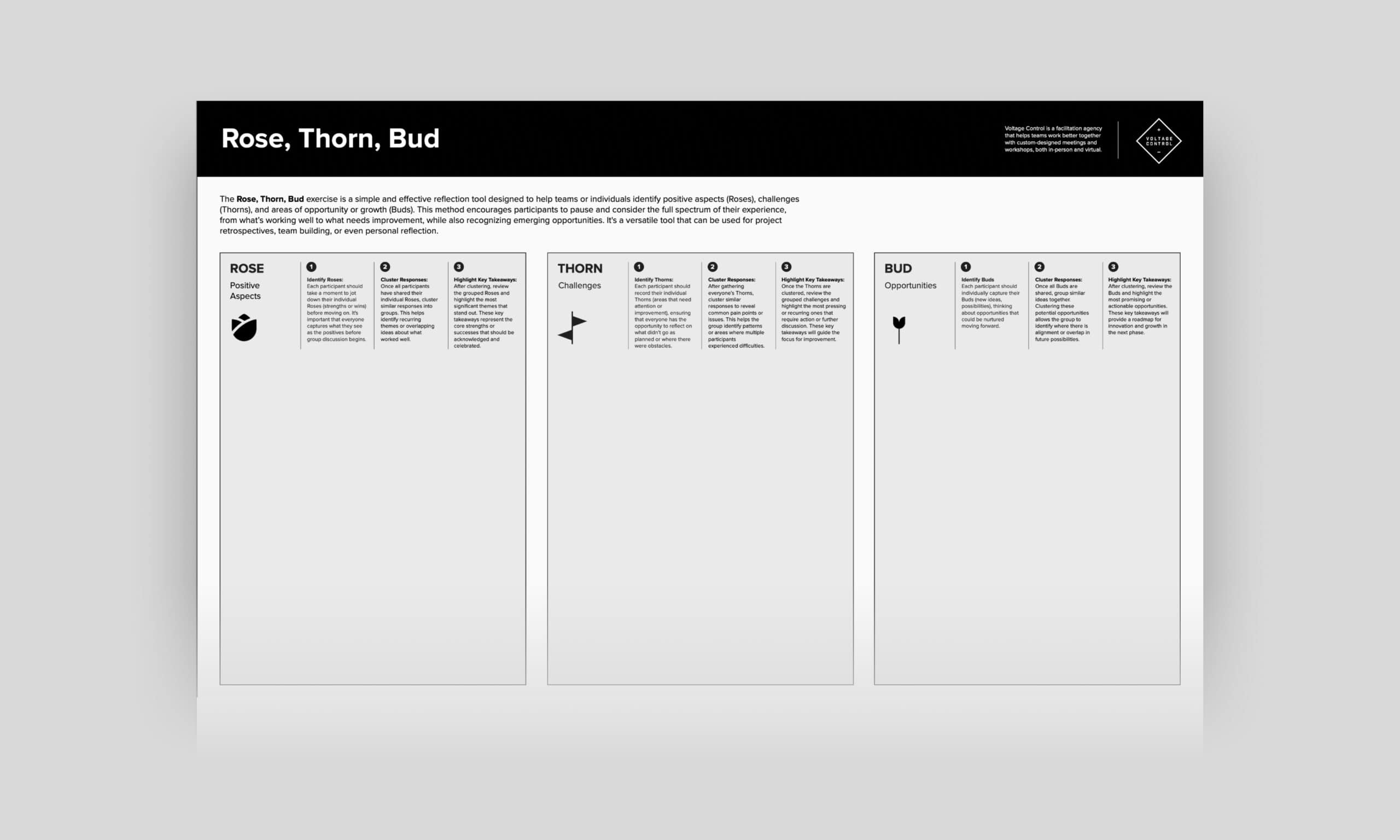 This exercise helps teams or individuals reflect on positives (Roses), challenges (Thorns), and growth opportunities (Buds) to gain a holistic view of their experiences.
