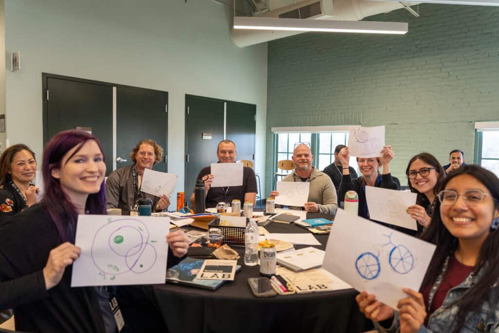 To give participants a visceral experience of what co-creation actually feels like, Shannon ran a deceptively simple exercise: each person drew three random circles on a piece of paper, then passed it to the neighbor on their right, who transformed those circles into something new. Tables then found the connections between what had emerged.