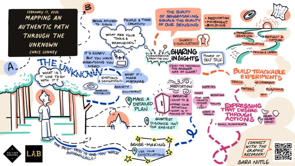 At the summit, we used it to help participants surface AI-related edges and convert them into tangible next steps. In eight minutes, participants lined up present realities, named a threshold, envisioned the near future, and identified the smallest real actions to cross it.