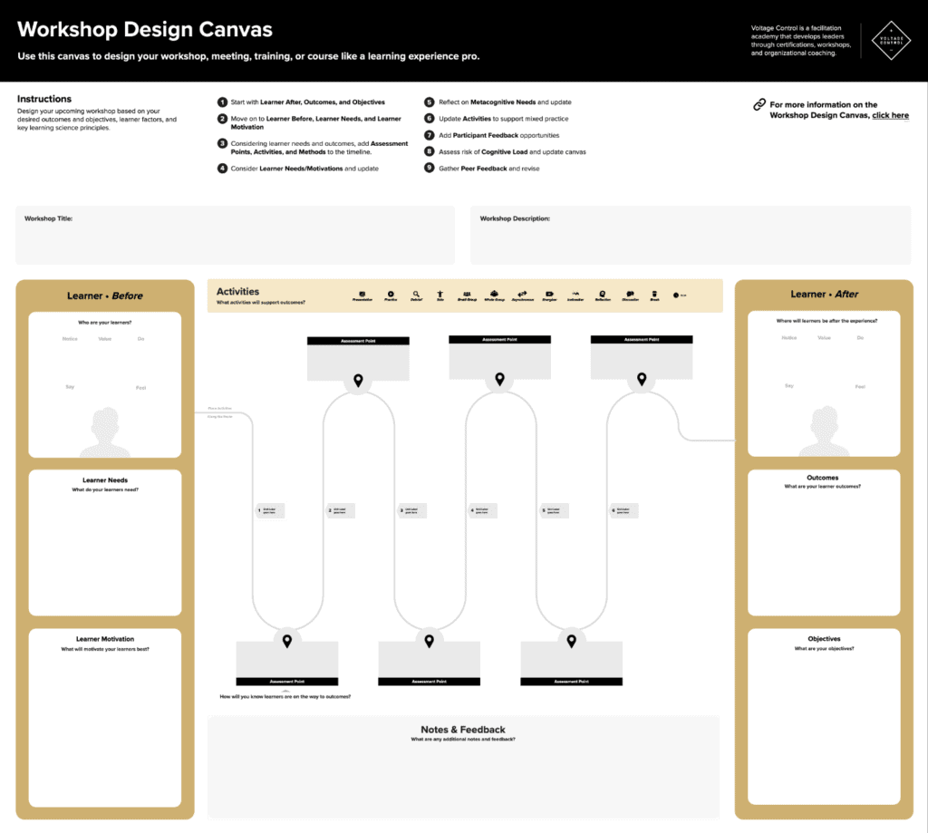 Use this canvas to design your workshop, meeting, training, or course like a learning experience pro.